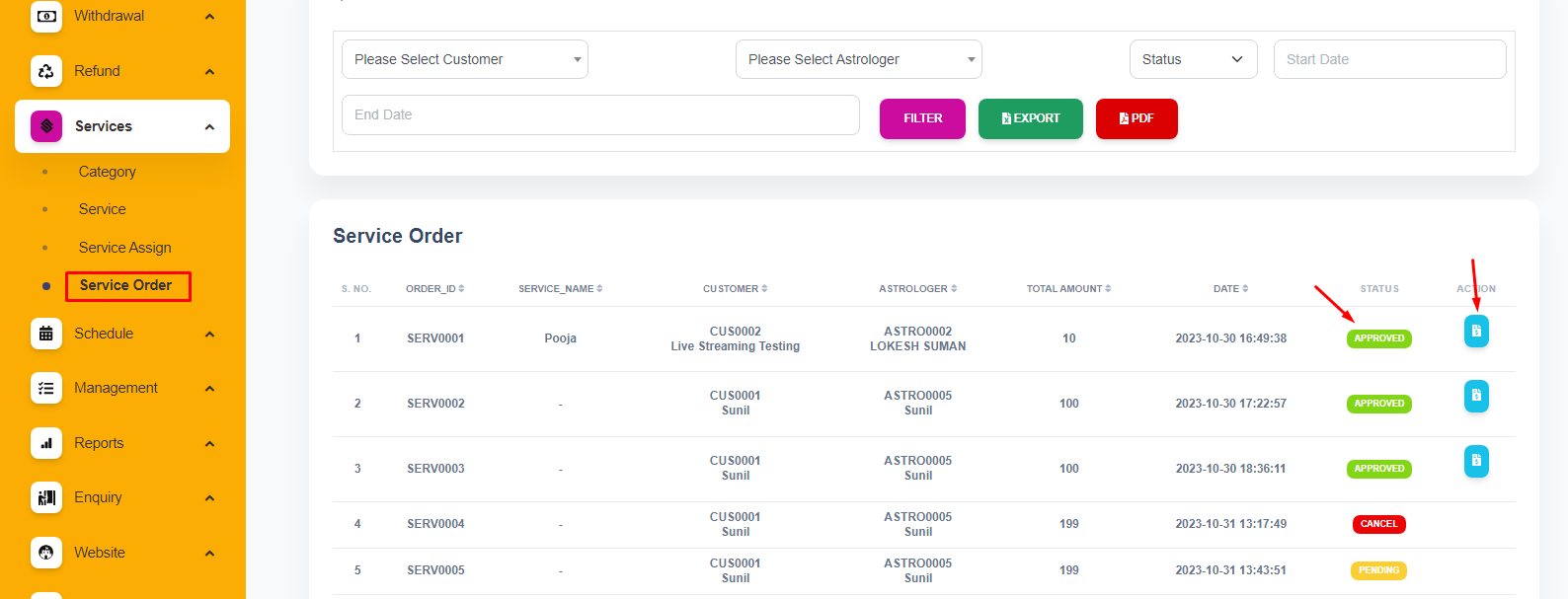 You have the option to review the order ID, service name, customer, astrologer, total amount, duration, date, and invoice.